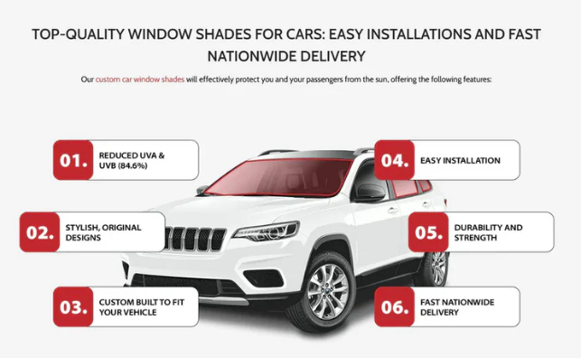 Our custom car window shades will effectively protect you and your passengers from the sun, offering the following features