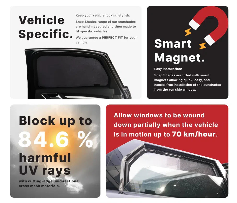 Our magnetic, custom-fit car window sunshades are crafted with premium materials and advanced German technology, designed using the latest 3D laser scanning process to ensure a perfect fit. They provide reliable protection against harmful UV rays, excessive heat, and glare, while the breathable mesh fabric doubles as an insect barrier for added comfort. The shades allow you to keep your windows partially open for airflow without losing protection, and the strong built-in magnets make installation and removal quick and effortless. With maximum shielding from sunlight and clear visibility through the perforated design both day and night, these sunshades combine convenience, safety, and comfort for every ride.